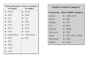 Υποστηρίζει πάρα πολλούς τύπους αρχείων,δέχεται εισαγωγή από ψηφιακές μηχανές και σώζει τις επεξεργασμένες φωτογραφίες σε διαφορετικά formats όπως μπορείτε να δείτε στην ακόλουθη εικόνα: